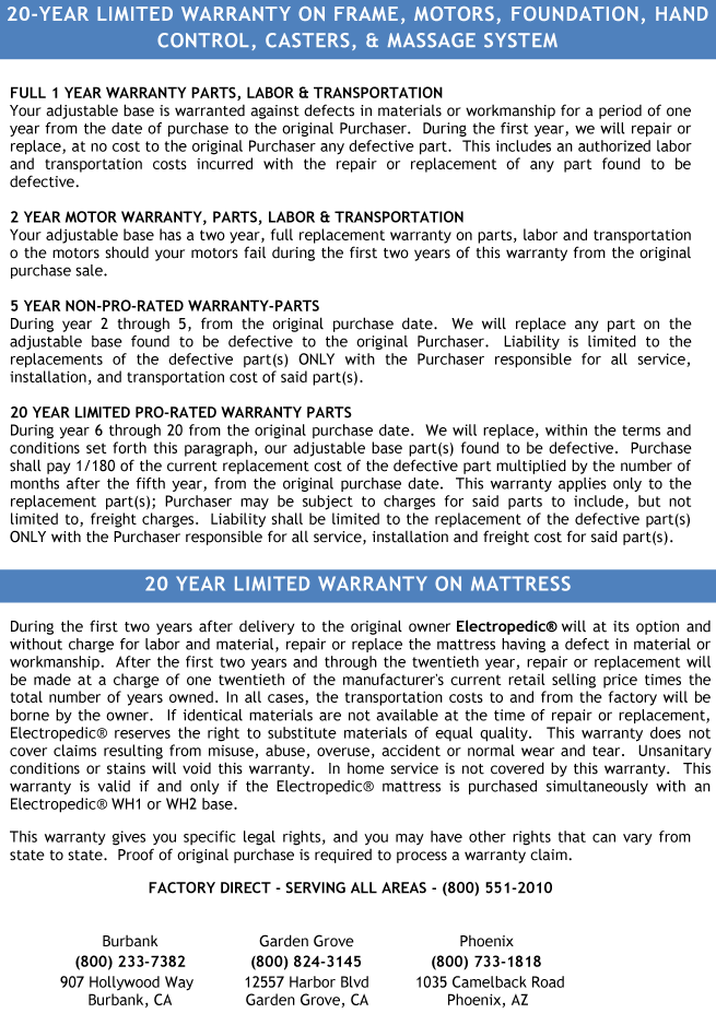 The Electropedic Guarantee is not just a little better than the competition; but a lot better. We offer a full limited 20 Year Warranty on the Adjustable Bed Frame, Motors, Mattress, Foundation, Hand Control, Casters and Massage System.