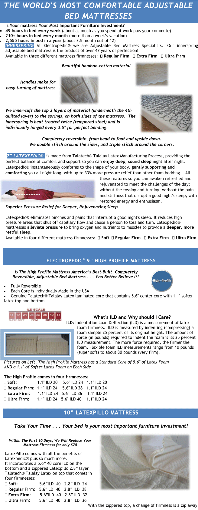 We've been asking the same questions since 1964; and after 46 years, we've gotten pretty good at it! We want you to get a GREAT NIGHTS SLEEP - and getting the Right Adjustable Bed Mattress and Firmness is what it is all about: innerspring, latex, Tempurpedic, or Air.